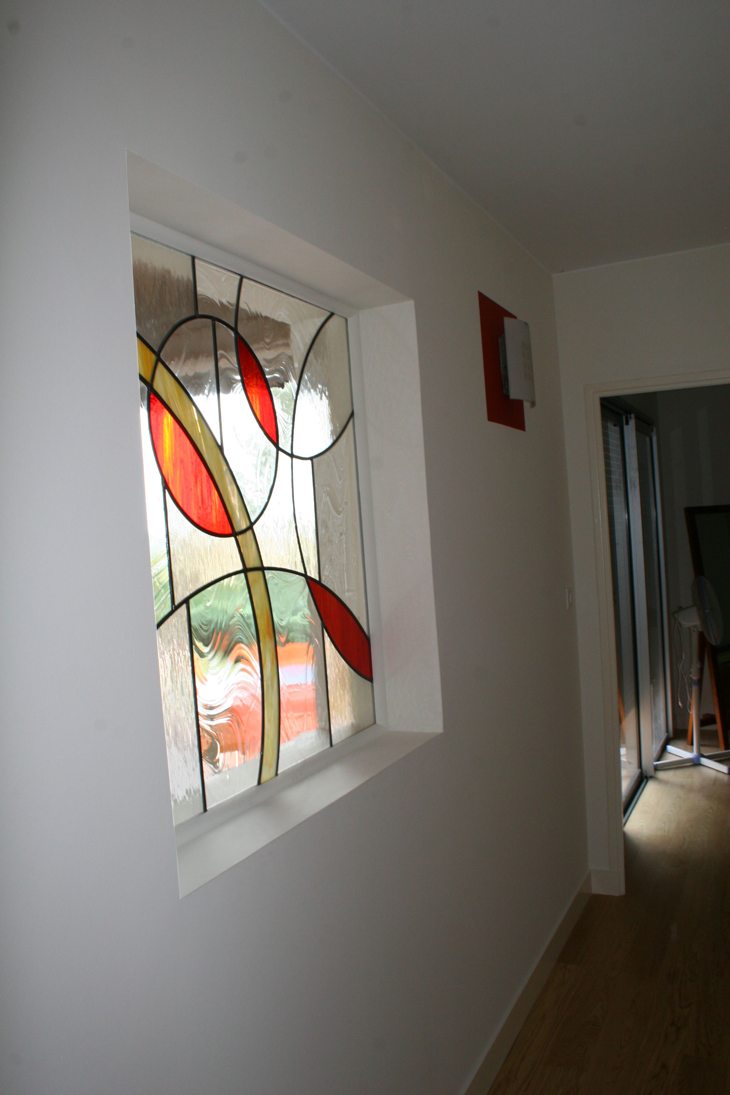 Vitrail dans cloison. Au plomb traditionnel armé. Entre couloir et une piscine intérieure. Profiter de l’éclairage naturel d’une pièce lumineuse pour éclairer un couloir sombre. Dimensions 100*100 cm