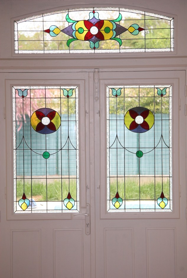 Panneaux de vitraux insérés dans un panneau monté en survitrage, dans une porte d’entrée. Une porte pleine a été évidée pour laisser passer la lumière. Vitrail reprenant les codes de l’Art Nouveau