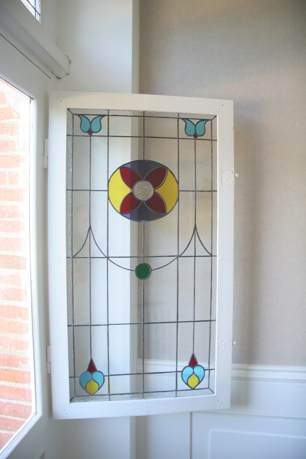 Panneaux de vitraux insérés dans un panneau monté en survitrage, dans une porte d’entrée. Une porte pleine a été évidée pour laisser passer la lumière. Vitrail reprenant les codes de l’Art Nouveau
