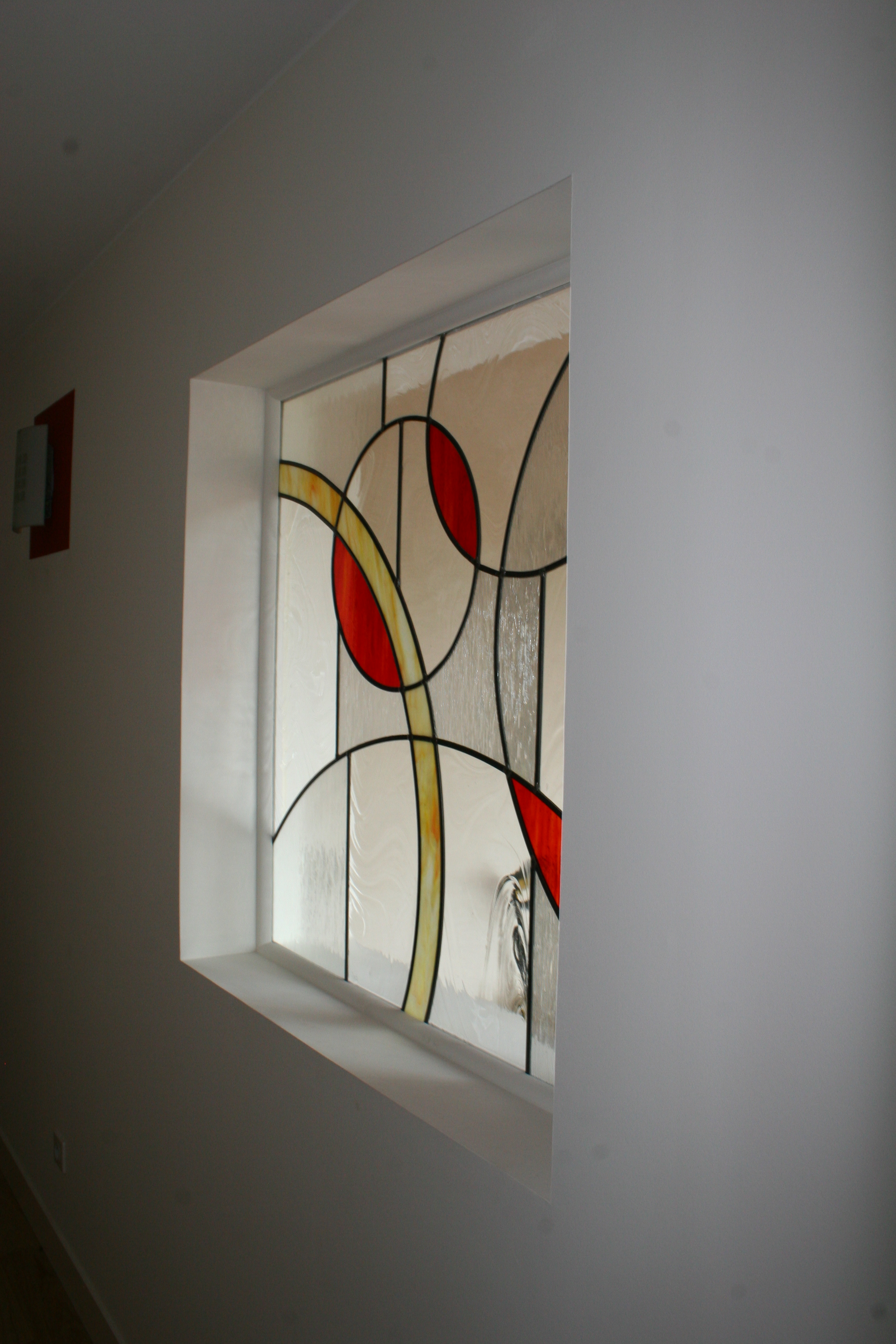 Vitrail dans cloison. Au plomb traditionnel armé. Entre couloir et une piscine intérieure. Profiter de l’éclairage naturel d’une pièce lumineuse pour éclairer un couloir sombre. Dimensions 100*100 cm