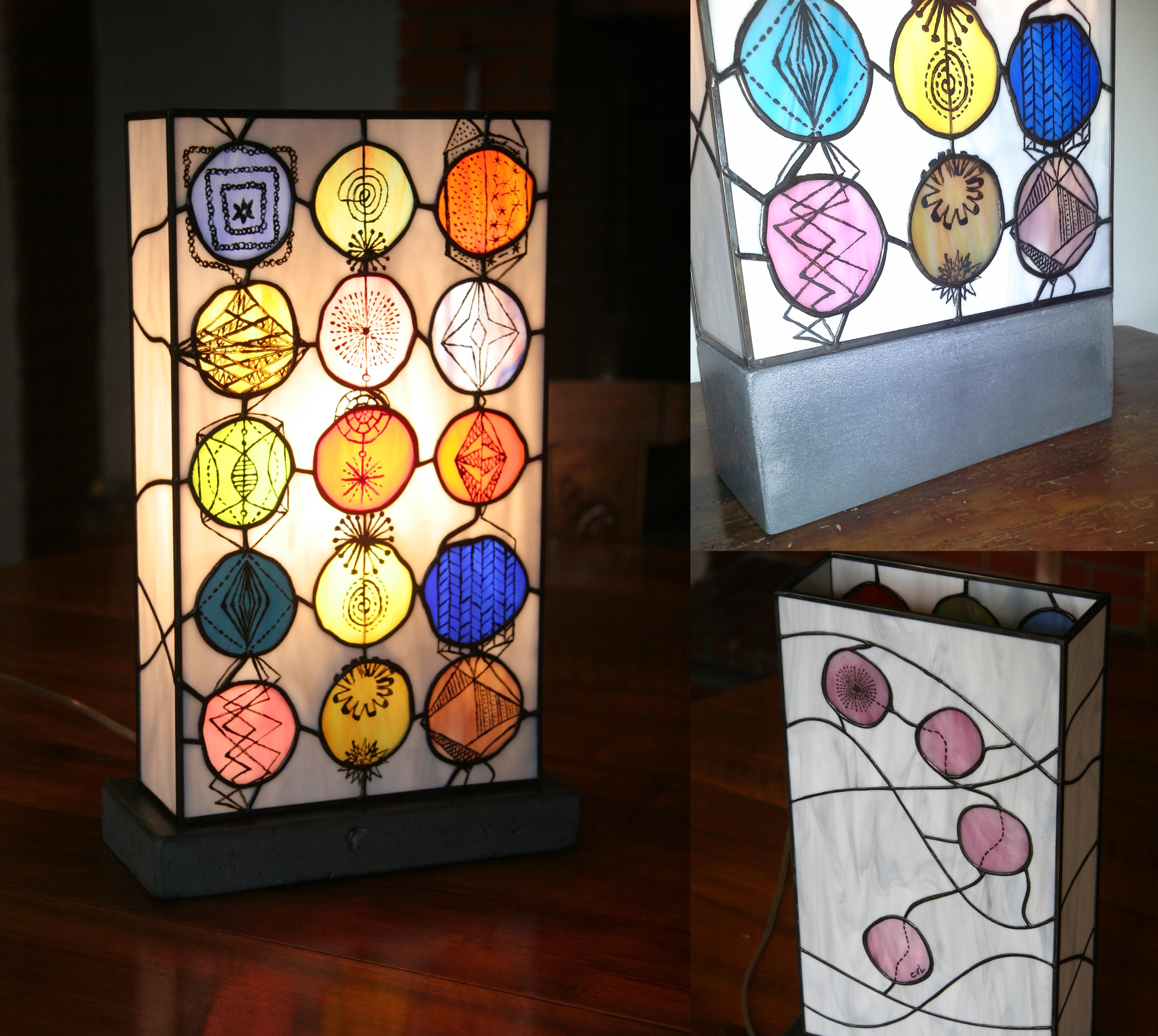 Lampe contemporaine « Signes » en vitrail Tiffany constituée de verres opalescents de couleurs multiples. Dessins représentant des signes « naïfs » peints à la grisaille et cuits à 650 °. Taille hauteur 39 cm largeur 23 cm épaisseur 11 cm. Socle en béton ciré gris anthracite lui assurant un aspect très moderne et une grande stabilité.