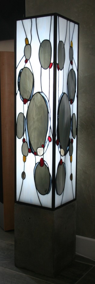 EXCEPTIONNELLE !! Par sa taille (110 cm de haut, côtés 20*20) et son design : Stonefalls est une représentation graphique d’une chute de pierres, elle est constituée de verres gris et blancs opalescents ainsi que de touches de verre noir. De petits cailloux sont symbolisés en rouge et jaune (fusing : pièces de verres cuits à 750°) mais aussi de véritables galets qui ont été sciés à l’eau pour être translucides. Peinture à la grisaille (cuisson 600 °). Très contemporaine, son socle est en béton pour un rendu « industriel ». L’éclairage est assuré par un tube fluorescent pour une belle luminosité et une consommation de seulement 20W