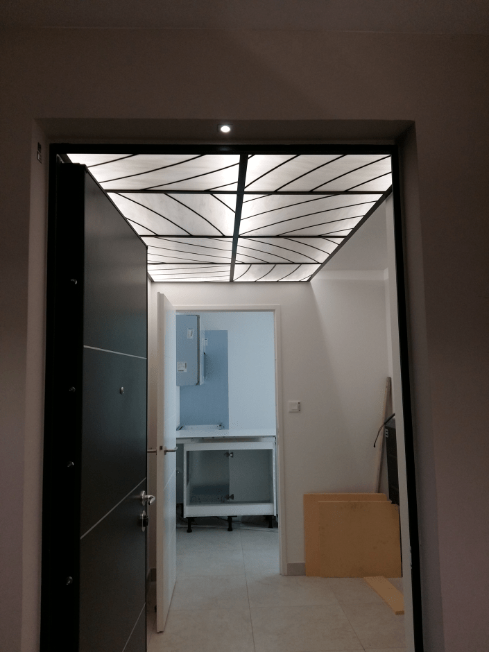 Plafond lumineux posé dans une structure acier. Rétro-éclairé, il est composé de 8 panneaux de 67*62 cm pour une longueur totale de 260*140 cm. Vitrail au plomb armé et verre opalescent blanc