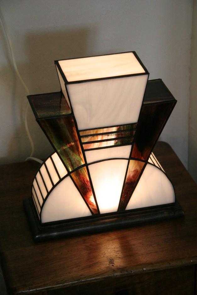 Lampe Art Déco en vitrail Tiffany. Verres opalescent blanc et violet strié de vert, de rouge et de bleu. Socle en noyer massif teinté wengé. L27*l12*H28