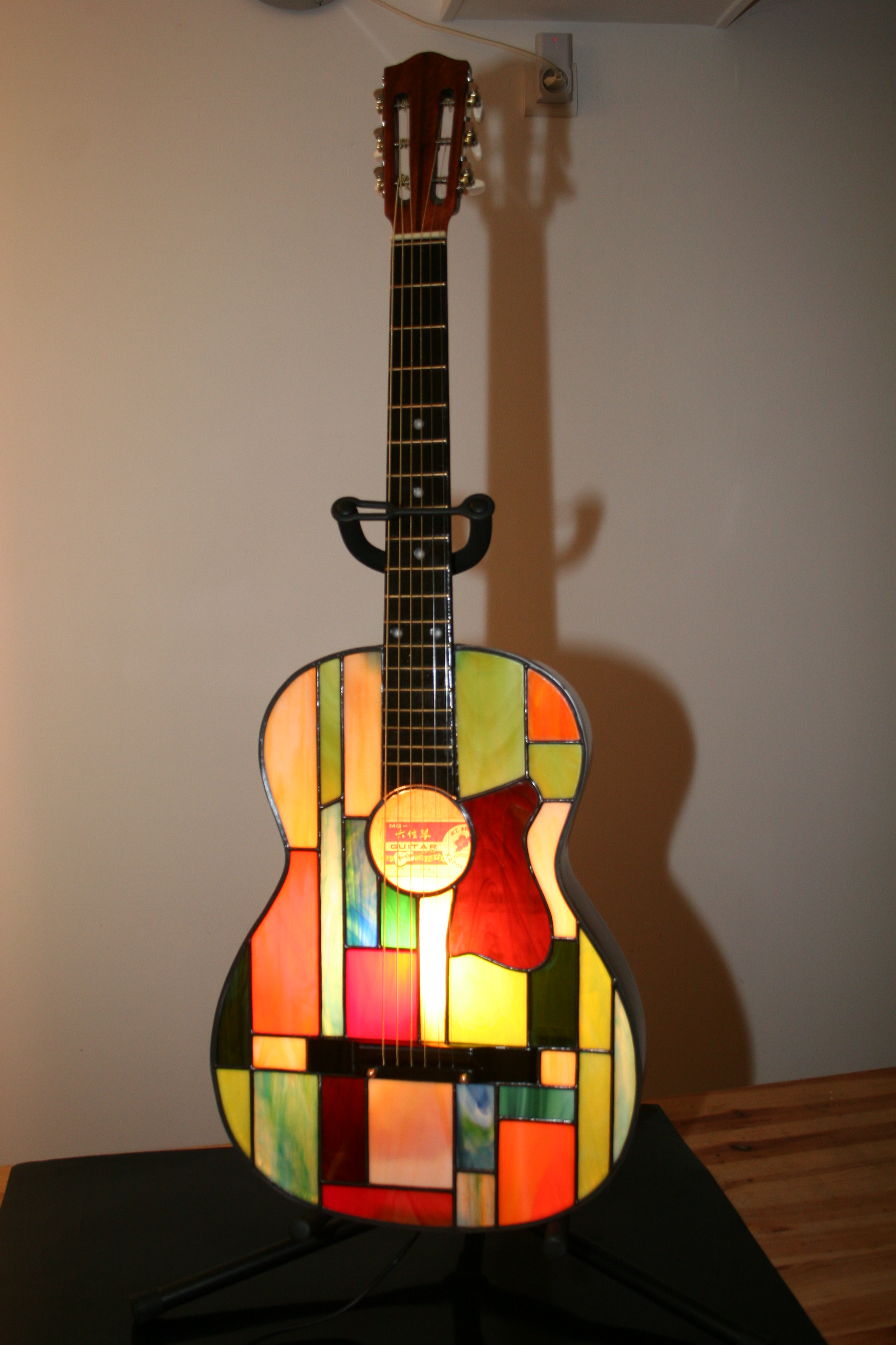 Pièce d’exception : extrême originalité, design, élégance mais aussi « fun » pour cette guitare électrifiée pouvant être posée au sol, sur un meuble ou suspendue au mur. Caisson de guitare véritable en bois dont le panneau avant a été remplacé par un panneau de vitrail constitué de verres opalescents vous garantissant un éclairage d’ambiance doux mais très lumineux. L’ampoule E14 fournie de 40 W peut être changée au moyen d’un système très simple (mode d’emploi fourni) permettant l’accés à l’ampoule. Pièce unique, signée et numérotée. Hauteur 95 cm, largeur 35 cm