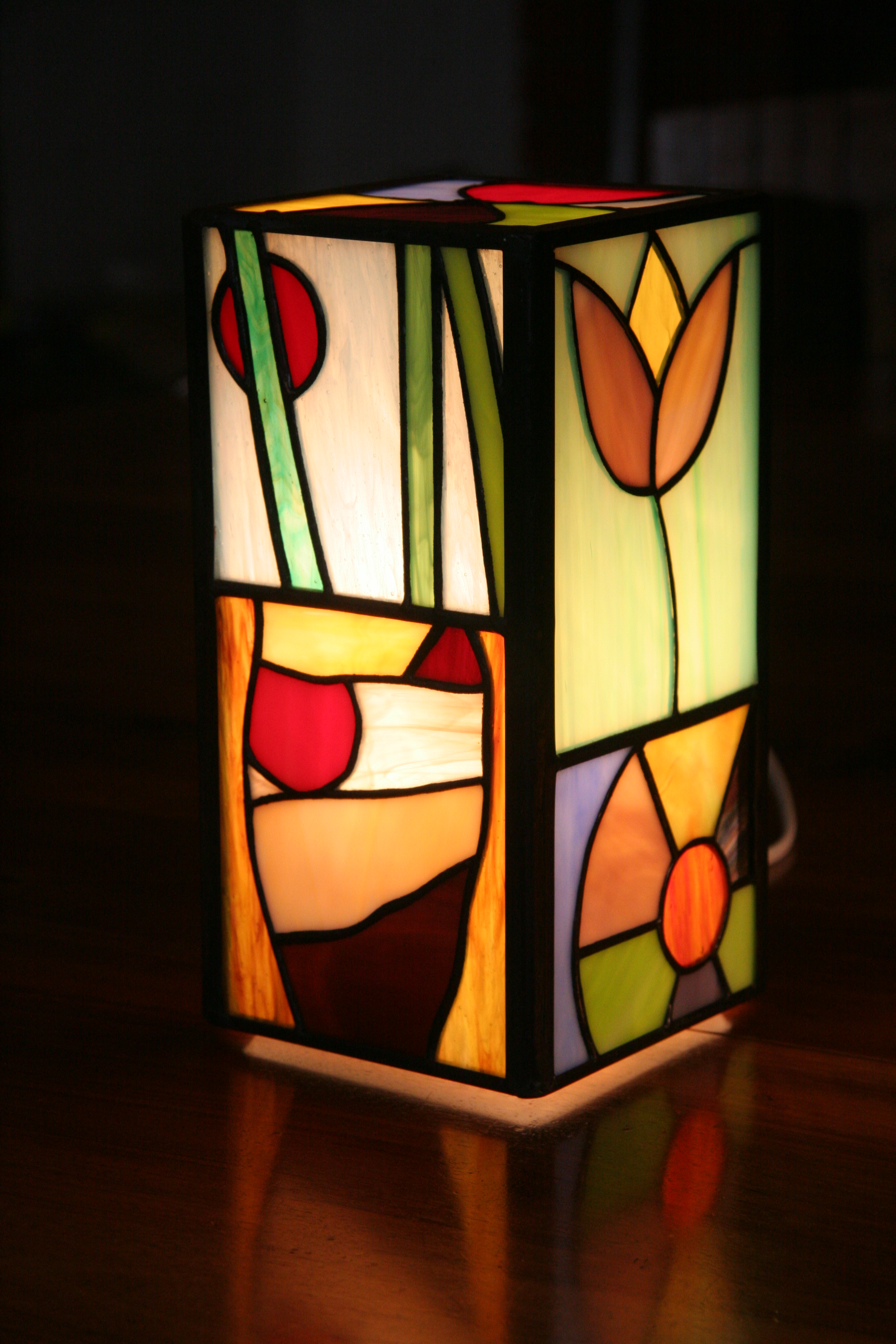 Lampe « Naïve » contemporaine en vitrail Tiffany. Ses représentations figuratives naïves confèrent à cette lampe une allure très gaie, lumineuse et très colorée. Elle est constituée de verres opalescents multicouleurs.