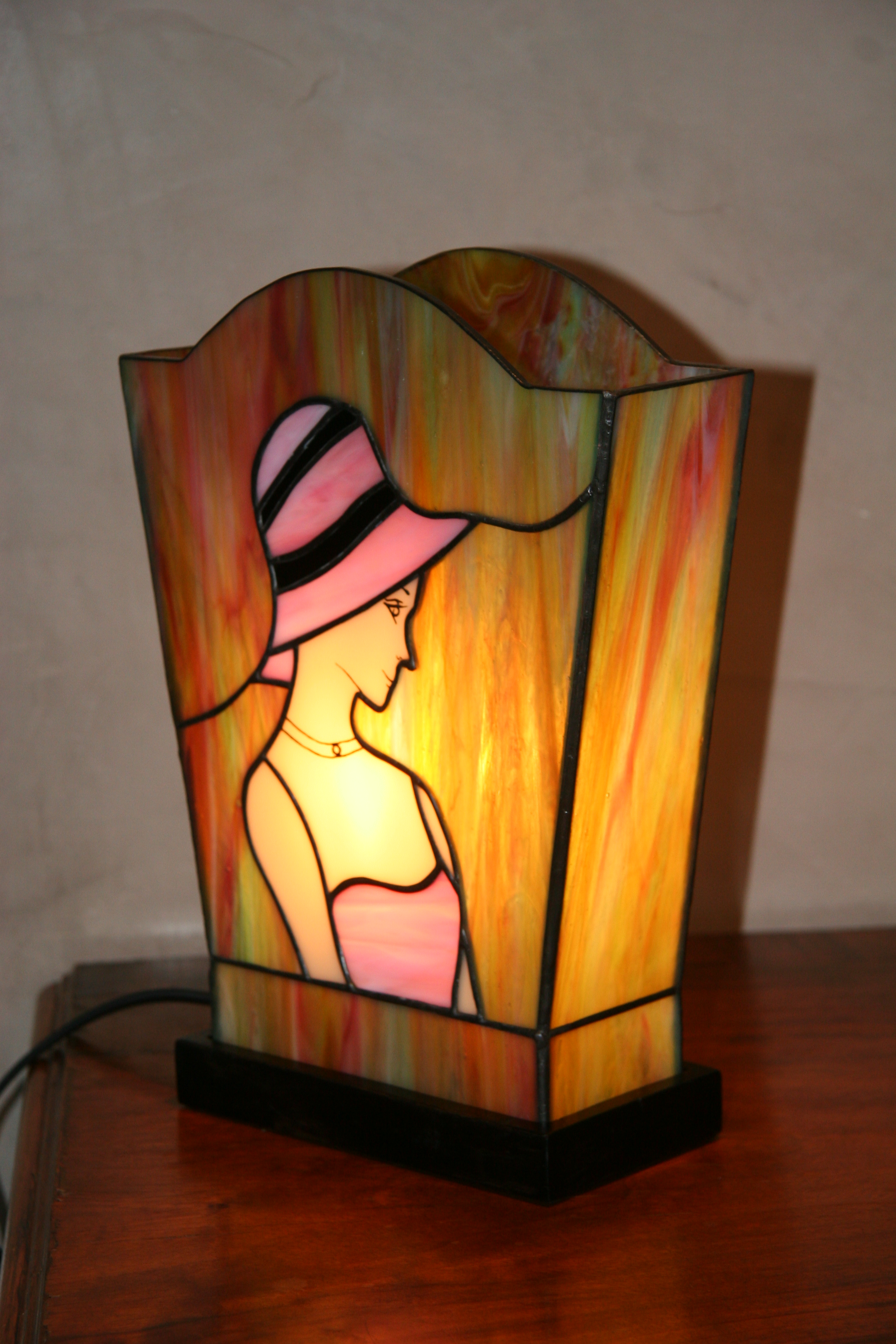 Lampe « L’Elegante » en vitrail Tiffany. Verre opalescent de couleur rose/blanc et chair pour le personnage et vert, bleu, rose et jaune doré pour le fond. Visage peint à la grisaille et cuit à 600°. Largeur bas 16 cm Largeur haut 21 cm
