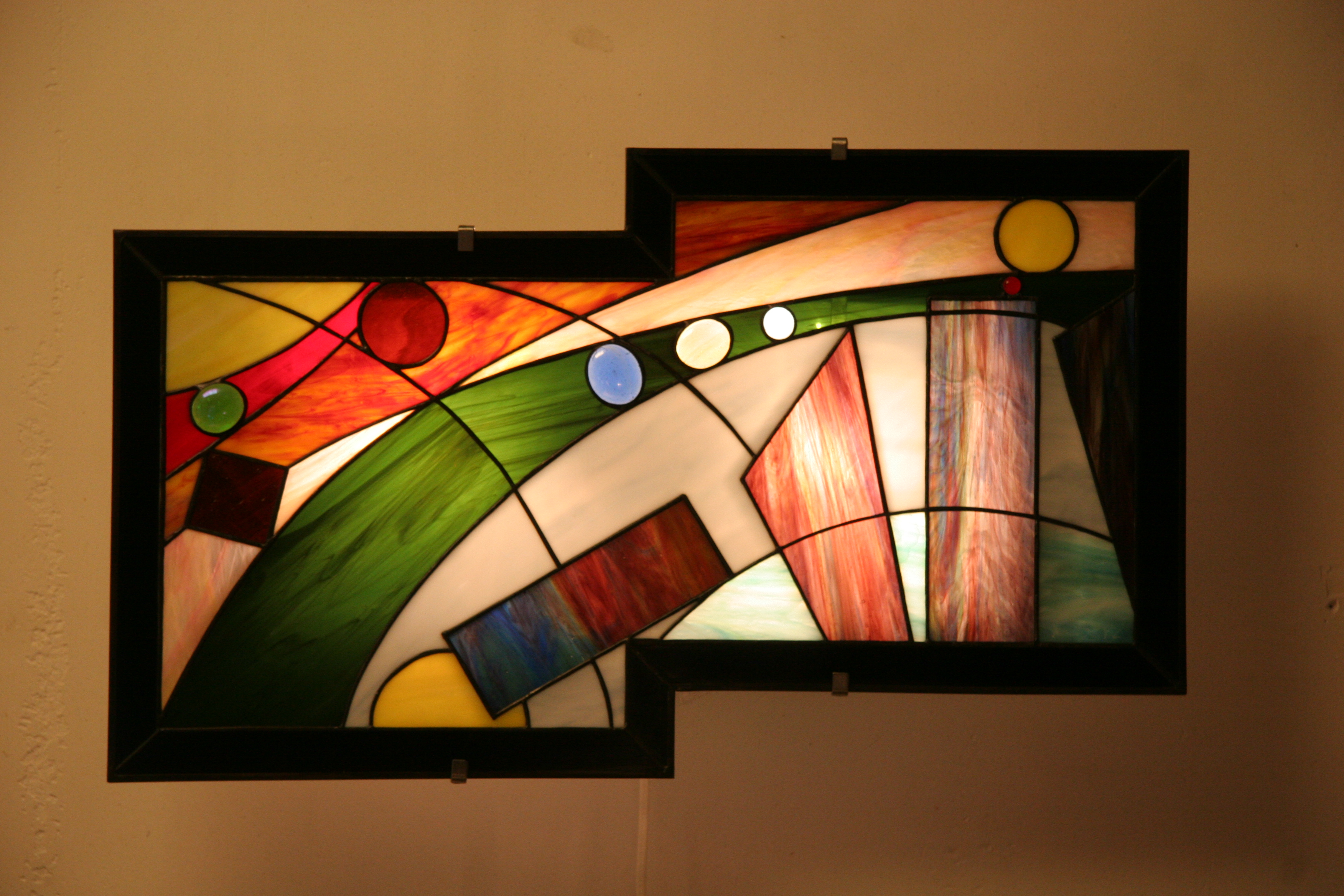 Nineleven : applique murale vitrail Tiffany, verres opalescents. Montée sur structure électrifiée en acier blanc. Hauteur 26 cm, largeur 56 cm.
