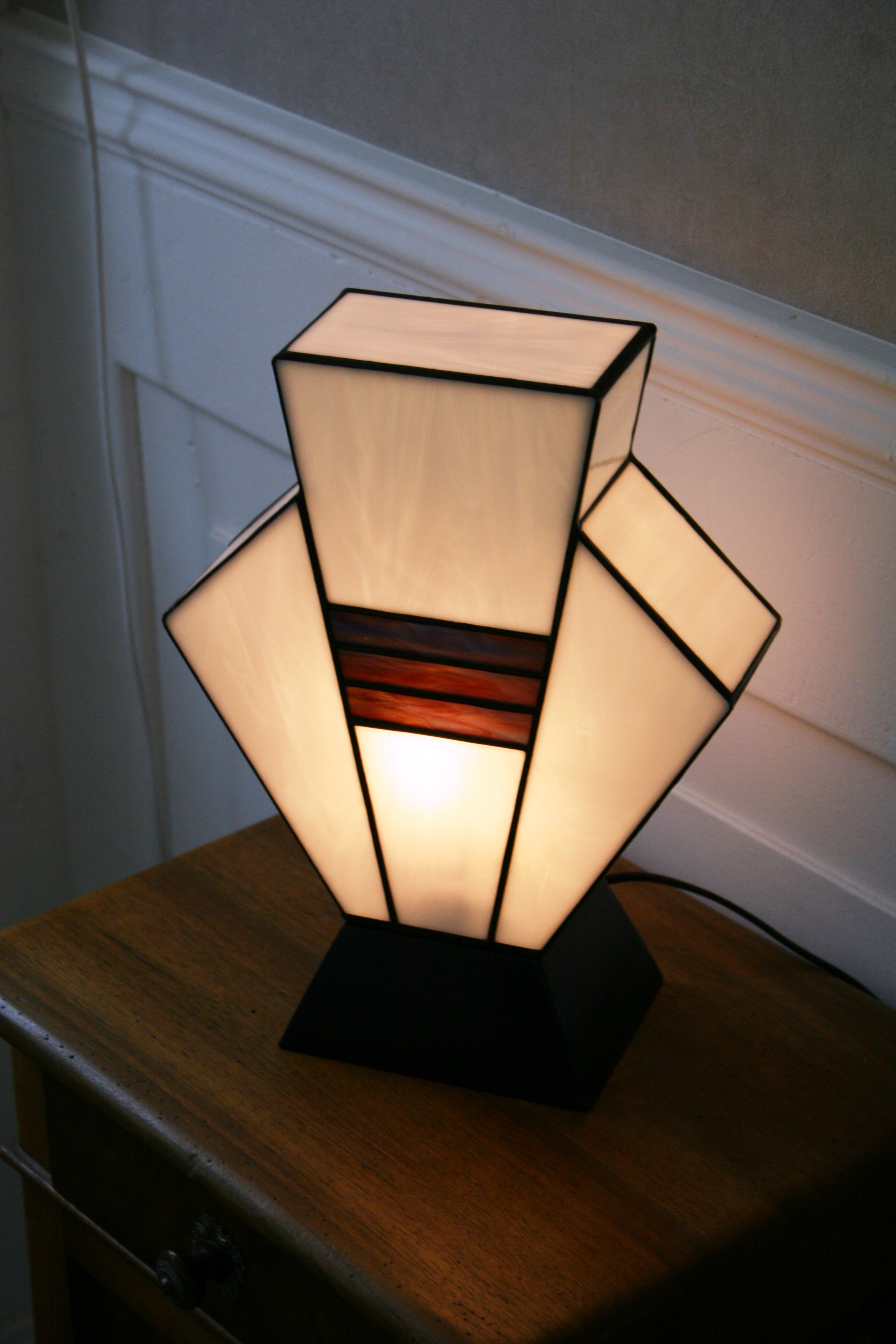 Lampe Art Déco en vitrail Tiffany « Simplissime ». Verres opalescents blanc et violet strié de vert. Socle en bois vernis noir. Largeur 17 cm, Epaisseur 17 cm, Hauteur 36 cm