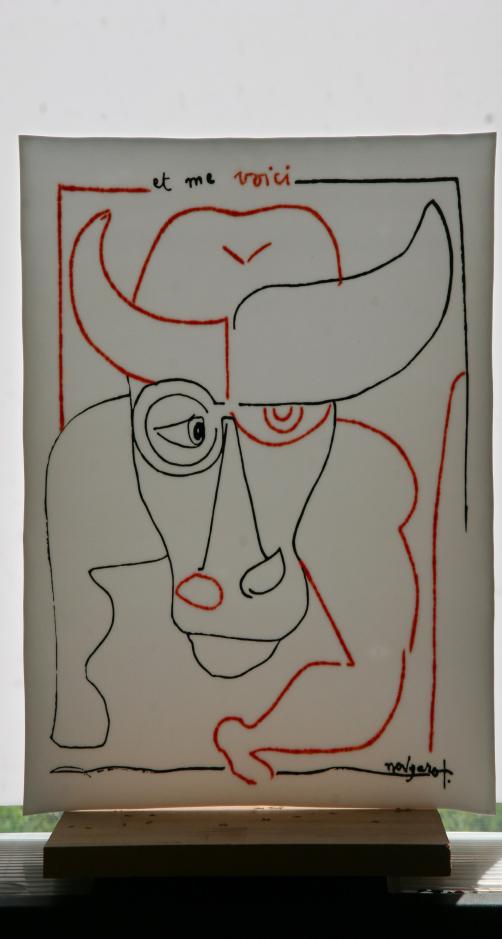 Reproduction à la grisaille et à la poudre de verre du dessin « et me voici » de Claude Nougaro. Avec l’aimable autorisation de Mme Hélène Nougaro