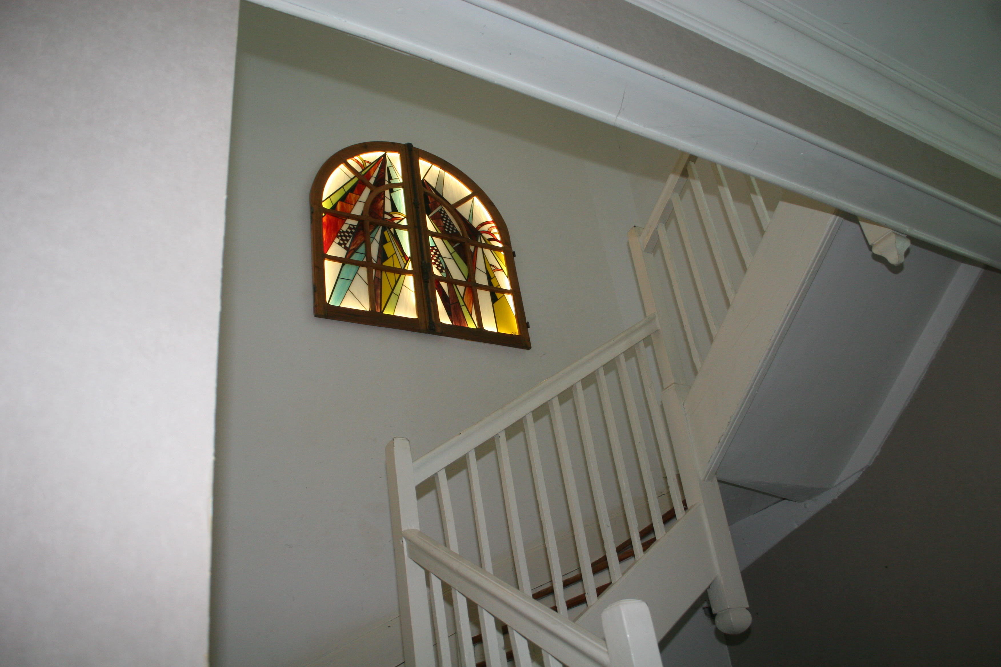 Exercice de style autour d’une véritable fenêtre en acacia massif provenant d’une maison de maître datant des années 20 habillée de 2 panneaux de vitraux contemporains représentant des immeubles Art Déco New-Yorkais, « Fenêtre sur cour » est une création de perspective futuriste mélangeant différents types de verres très lumineux (vert, jaune, rouge, orange, violet, bleu ciel, blanc et noir) à de l’aluminium perforé