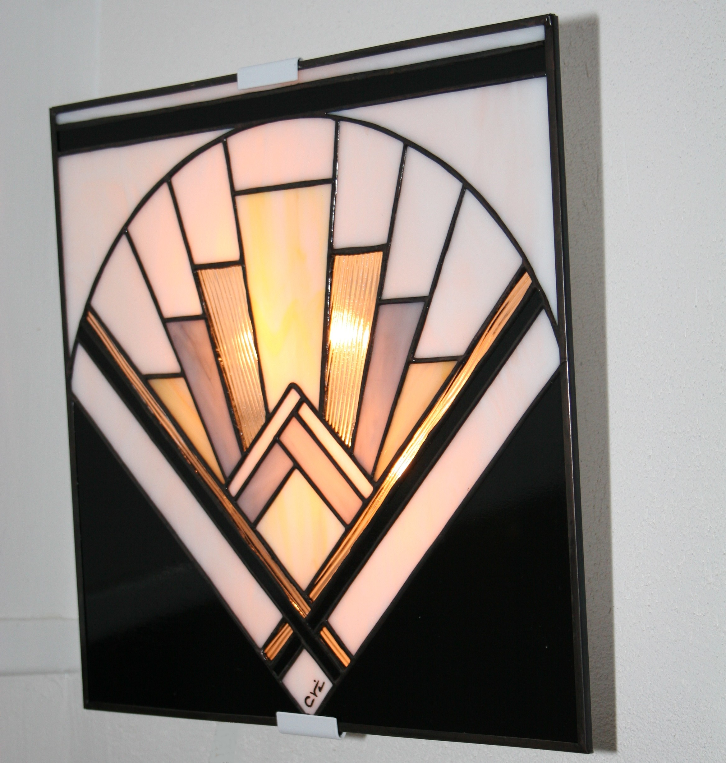« Evora » est une applique murale en vitrail Tiffany (dimensions 29 x 29 cm) d’inspiration Art Déco. Les verres, opalescents et de couleurs Blanc nacré, Noir, Transparent ciselé, Gris perle et Jaune pâle donneront à votre intérieur une ambiance à la fois lumineuse et chaleureuse. »Evora » est constituée de 35 pièces de verre montées en vitrail Tiffany, et les soudures, à l’étain, ont été patinées en noir pour un aspect ancien. Elle est montée sur une structure électrifiée en acier blanc (fournie), équipée de 2 encoches de suspension pour un accrochage aisé sur un mur disposant d’une arrivée électrique.